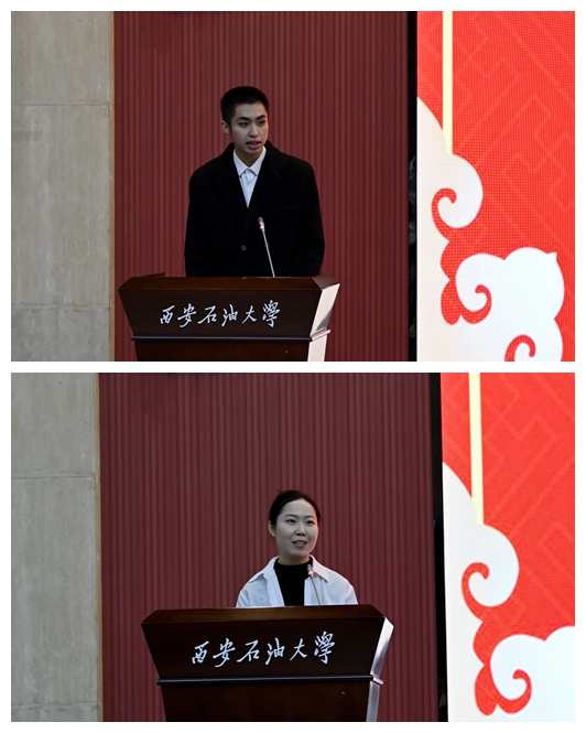 第六屆“全國(guó)百佳心理委員”國(guó)貿(mào)2001班姚湯博和經(jīng)濟(jì)管理學(xué)院優(yōu)秀指導(dǎo)教師任仰,作為師生代表上臺(tái)發(fā)言。