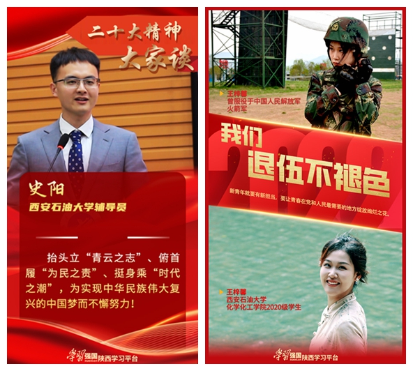 學(xué)校主動作為,選派專人擔(dān)任“學(xué)習(xí)強國”陜西學(xué)習(xí)平臺管理員和通訊員,嚴(yán)格按照平臺供稿規(guī)范要求積極供稿,確保供稿稿件導(dǎo)向正確、主題契合。踴躍參與“學(xué)習(xí)強國”陜西學(xué)習(xí)平臺主辦的“二十大精神大家談”“我們退伍不褪色”等主題征集活動,在更廣領(lǐng)域、更寬范圍講好西石大故事。三年來,“學(xué)習(xí)強國”陜西學(xué)習(xí)平臺共采用我校相關(guān)稿件100余篇,宣傳部武威獲評2022年度優(yōu)秀管理員(通訊員)。學(xué)校依托“學(xué)習(xí)強國”平臺強大資源優(yōu)勢,持續(xù)做好理論宣講和思想政治教育工作,不斷調(diào)動廣大師生在“學(xué)習(xí)強國”平臺學(xué)習(xí)的參與度和積極性。經(jīng)濟管理學(xué)院李春霄獲評2021年度優(yōu)秀學(xué)員,科技處杜永峰2023年受聘基層義務(wù)宣傳員。2023年9月,學(xué)校開通“學(xué)習(xí)強國”同學(xué)匯,積極發(fā)布報道校園動態(tài),多次登上全國高校熱度榜,持續(xù)引導(dǎo)廣大學(xué)生學(xué)好用好同學(xué)匯。機械工程學(xué)院工業(yè)設(shè)計系師生設(shè)計的“學(xué)習(xí)強國”聯(lián)合文創(chuàng)產(chǎn)品,上架強國商城,成為周年慶的限量產(chǎn)品,廣受好評。