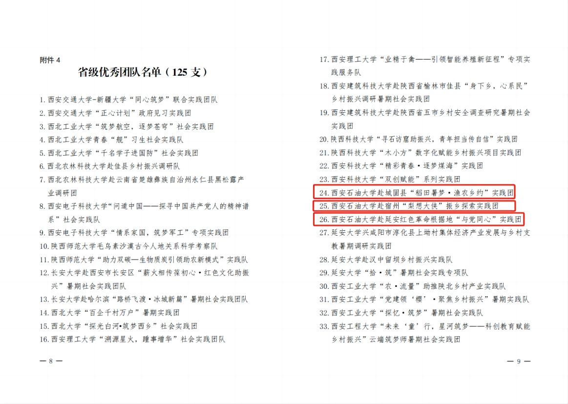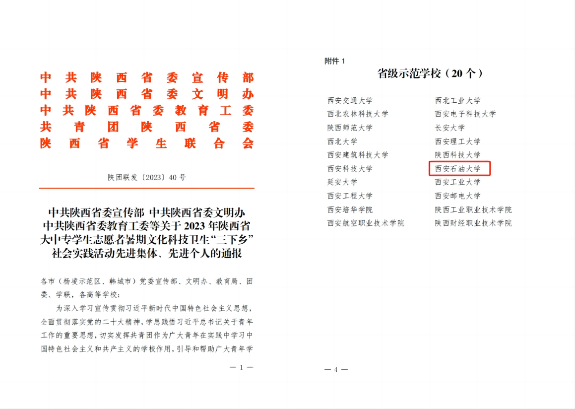近日,由陜西省委宣傳部、省委文明辦、省委教育工委、團(tuán)省委、省學(xué)聯(lián)等單位聯(lián)合組織開(kāi)展的“2023年陜西省大中專(zhuān)學(xué)生志愿者暑期文化科技衛(wèi)生‘三下鄉(xiāng)’社會(huì)實(shí)踐活動(dòng)”評(píng)選表彰結(jié)果揭曉,我校榮獲2023年“三下鄉(xiāng)”活動(dòng)省級(jí)示范學(xué)校,地球科學(xué)與工程學(xué)院“赴城固縣‘稻田暑夢(mèng)·漁農(nóng)鄉(xiāng)約’實(shí)踐團(tuán)”、經(jīng)濟(jì)管理學(xué)院“赴宿州‘梨想大俠’振鄉(xiāng)探索實(shí)踐團(tuán)”、石油工程學(xué)院赴“延安紅色革命根據(jù)地‘與黨同心’實(shí)踐團(tuán)”被評(píng)為省級(jí)優(yōu)秀團(tuán)隊(duì)。王澤文、宋亞文、劉宇航被評(píng)為省級(jí)先進(jìn)個(gè)人。經(jīng)濟(jì)管理學(xué)院《數(shù)商興農(nóng)背景下農(nóng)村電商發(fā)展影響因素及優(yōu)化策略調(diào)研報(bào)告》被評(píng)為省級(jí)優(yōu)秀調(diào)研報(bào)告,并獲團(tuán)省委專(zhuān)項(xiàng)資助。