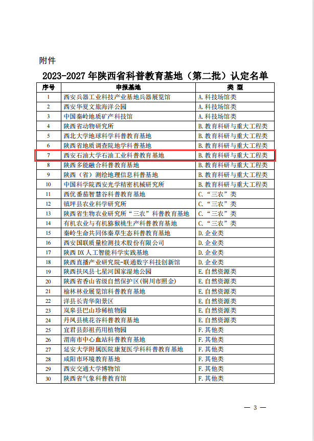 近日,陜西省科學技術(shù)協(xié)會聯(lián)合陜西省科學技術(shù)廳組織開展了“2023-2027年陜西省科普教育基地(第二批)”認定工作。經(jīng)過申報推薦、專家評審、審定公示等程序,我校“石油工業(yè)科普教育基地”成功獲批“陜西省科普教育基地”。