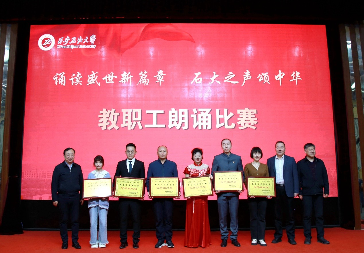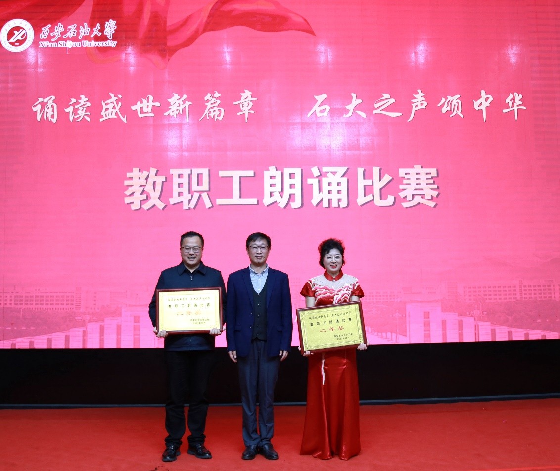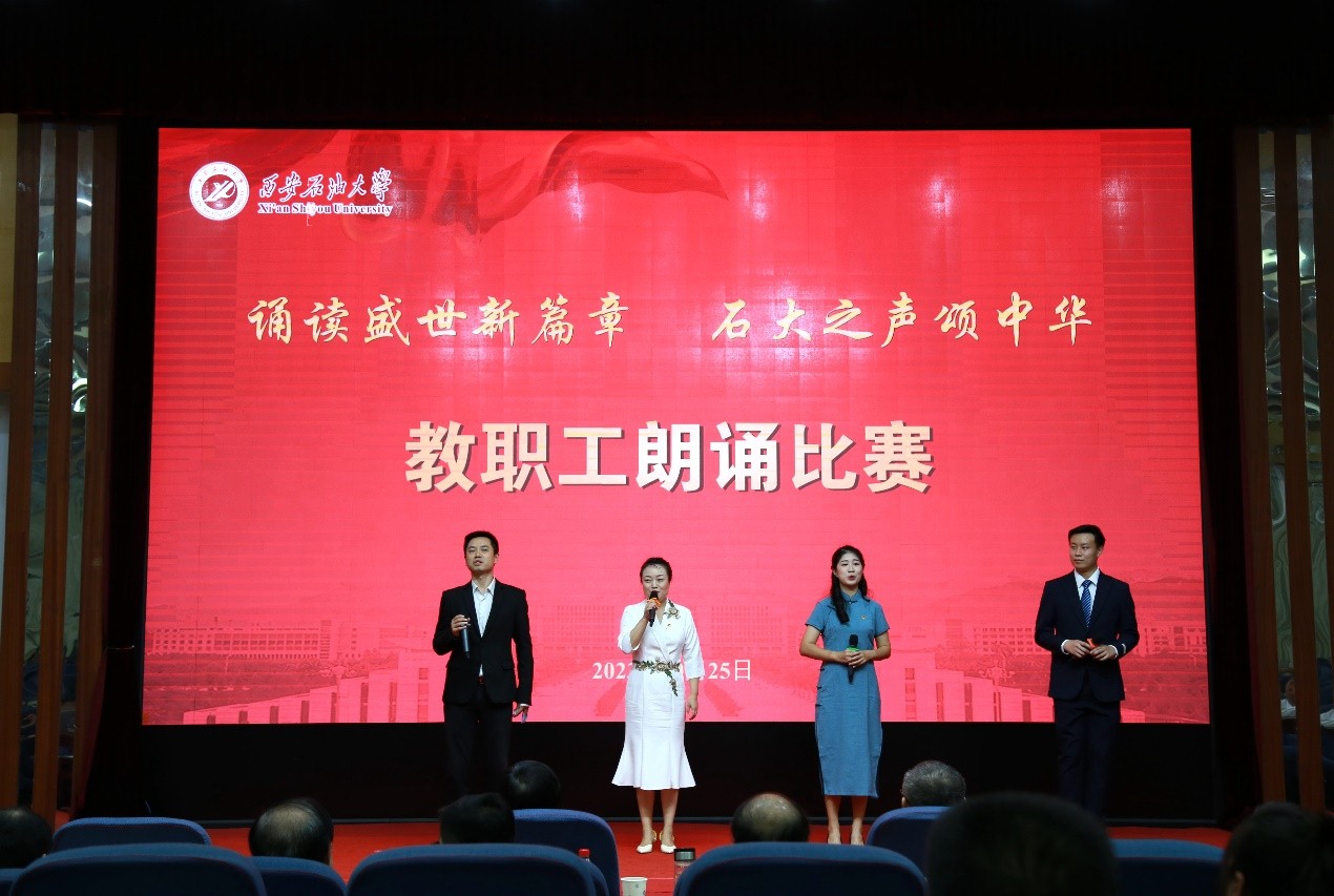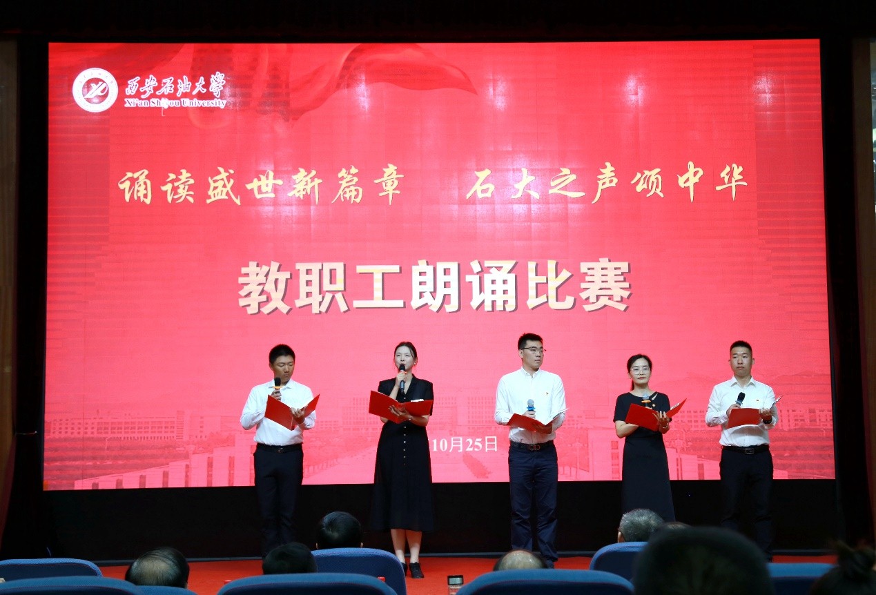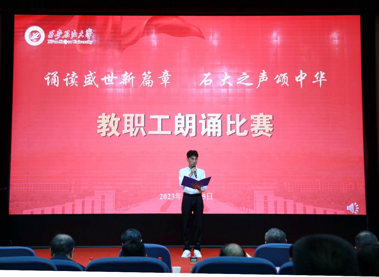 為深入學(xué)習(xí)宣傳貫徹習(xí)近平新時(shí)代中國(guó)特色社會(huì)主義思想和習(xí)近平總書(shū)記對(duì)宣傳思想文化工作的重要指示精神,弘揚(yáng)石油精神、鐵人精神,進(jìn)一步強(qiáng)化思想引領(lǐng)、凝聚思想共識(shí),推進(jìn)教職工文化建設(shè)、豐富教職工精神生活,10月25日下午,我?!罢b讀盛世新篇章 石大之聲頌中華”教職工朗誦比賽在雁塔校區(qū)會(huì)議中心學(xué)術(shù)報(bào)告廳舉行,校黨委書(shū)記常江、副校長(zhǎng)蘇文甫出席了此次活動(dòng)。22家部門(mén)工會(huì)選送了作品參賽,200余名師生觀看了比賽。