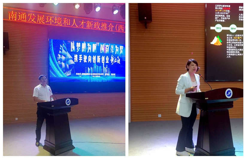 曹星暉代表人力資源和社會保障局作“南通發(fā)展環(huán)境和人才政策”推介,從產(chǎn)業(yè)提質(zhì)擴(kuò)量、交通樞紐建設(shè)、營商環(huán)境優(yōu)化、城市品質(zhì)提升、生活品質(zhì)提升等方面介紹了南通市經(jīng)濟(jì)發(fā)展情況和人才新政。江蘇羅化新材料有限公司董事長羅雪方作為企業(yè)代表,結(jié)合自身創(chuàng)業(yè)經(jīng)歷分享了南通市優(yōu)質(zhì)的創(chuàng)業(yè)環(huán)境和引才留才舉措。