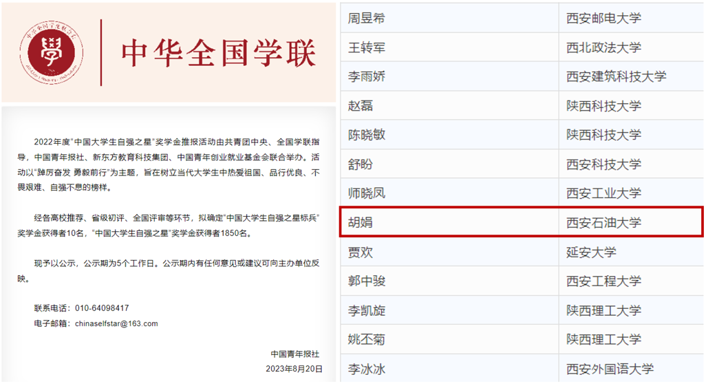 近日,由共青團(tuán)中央、全國(guó)學(xué)聯(lián)指導(dǎo),中國(guó)青年報(bào)社、新東方教育科技集團(tuán)、中國(guó)青年創(chuàng)業(yè)就業(yè)基金會(huì)聯(lián)合開(kāi)展的2022年度“中國(guó)大學(xué)生自強(qiáng)之星”尋訪活動(dòng)結(jié)果揭曉。我校石油工程學(xué)院研2021級(jí)胡娟榮獲“中國(guó)大學(xué)生自強(qiáng)之星”和“陜西省大學(xué)生自強(qiáng)之星標(biāo)兵”,石工(教改)2001班梁歡榮獲“陜西省大學(xué)生自強(qiáng)之星”。