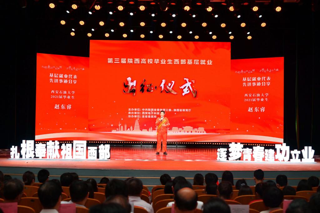 為積極響應國家鼓勵畢業(yè)生到西部、到基層、到祖國最需要的地方建功立業(yè),引導畢業(yè)生將個人理想與國家發(fā)展需要緊密結合,著力發(fā)揮陜西服務“西部大開發(fā)”的人才優(yōu)勢,7月8日晚,第三屆陜西高校畢業(yè)生西部基層就業(yè)出征儀式在西安電子科技大學舉行。陜西省委教育工委書記劉建林為赴西部基層就業(yè)的畢業(yè)生代表們授旗,教育部學生服務與素質發(fā)展中心黨委副書記、紀委書記、副主任楊大研和陜西省委教育工委副書記、省教育廳廳長王樹聲出席并講話。我校黨委副書記張木及石油工程學院2021屆碩士畢業(yè)生趙東睿受邀現場參加活動。