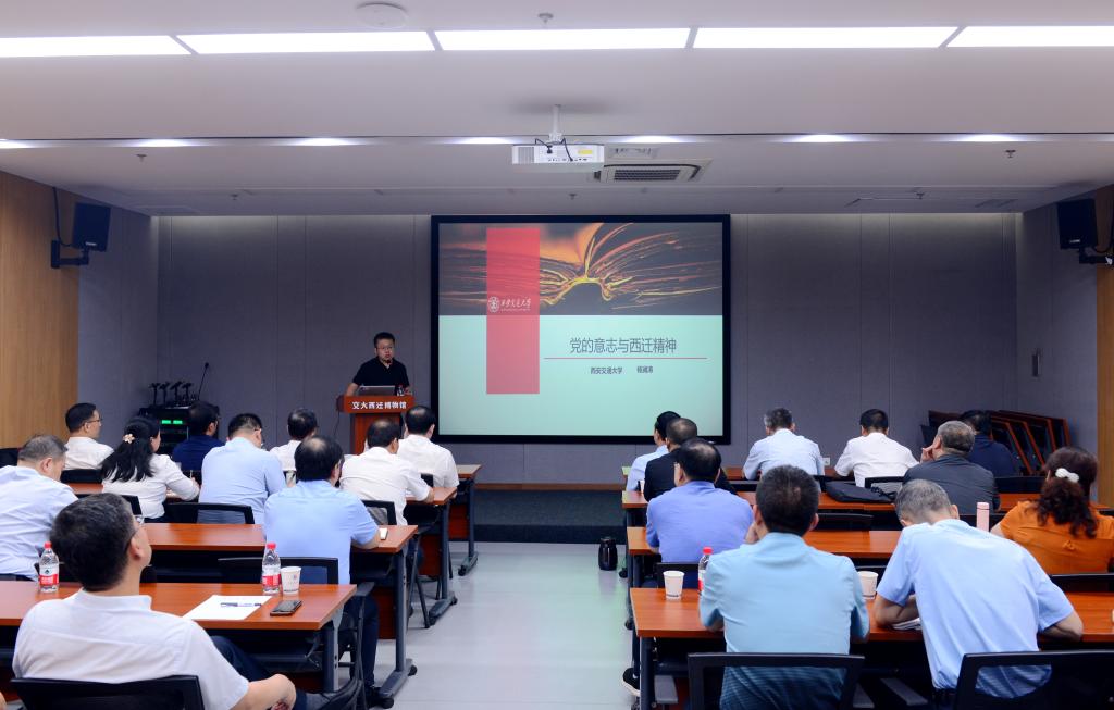 在實(shí)踐研學(xué)現(xiàn)場(chǎng)教學(xué)環(huán)節(jié),校黨委理論學(xué)習(xí)中心組(擴(kuò)大)在交大西遷博物館報(bào)告廳聽(tīng)取了專(zhuān)題黨課。西安交通大學(xué)校史與大學(xué)文化研究中心副研究館員、西遷精神宣講團(tuán)專(zhuān)家組成員楊瀾濤博士以《黨的意志與西遷精神》為題,對(duì)黨中央決策西遷的歷程及影響進(jìn)行了詳細(xì)講解。在交大西遷博物館,研學(xué)人員通過(guò)實(shí)地參觀和聆聽(tīng)講解員介紹,回顧了交通大學(xué)的西遷征程,領(lǐng)略了交大興學(xué)強(qiáng)國(guó)、崇德尚實(shí)的學(xué)風(fēng)與“起點(diǎn)高、要求嚴(yán)、基礎(chǔ)厚、重實(shí)踐”的優(yōu)良辦學(xué)傳統(tǒng),學(xué)習(xí)了“西遷人”感人至深的先進(jìn)事跡,體會(huì)了以“胸懷大局、無(wú)私奉獻(xiàn)、弘揚(yáng)傳統(tǒng)、艱苦創(chuàng)業(yè)”為核心內(nèi)涵的西遷精神。