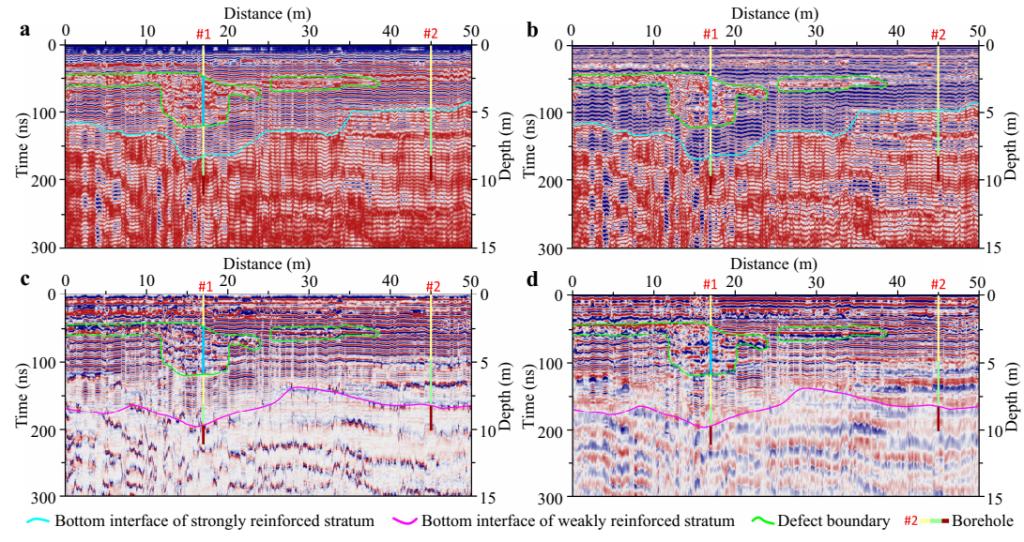 針對(duì)上述困難和挑戰(zhàn),研究團(tuán)隊(duì)歷時(shí)數(shù)年研究,通過(guò)理論推導(dǎo)、模型構(gòu)建、數(shù)值模擬、軟件開(kāi)發(fā)和現(xiàn)場(chǎng)試驗(yàn)等手段,創(chuàng)新提出了將樁基缺陷檢測(cè)轉(zhuǎn)化為地基加固質(zhì)量評(píng)價(jià)的思想,構(gòu)建出樁群加固地基的地質(zhì)模型,揭示了群樁條件下地基的地質(zhì)雷達(dá)(Ground Penetrating Radar,GPR)響應(yīng)特征,研發(fā)出GPR多屬性信息提取軟件新技術(shù),并建立了樁基缺陷檢測(cè)及地基加固質(zhì)量評(píng)價(jià)的GPR技術(shù)體系。依托甘肅省安臨高速公路建設(shè)項(xiàng)目,研究團(tuán)隊(duì)開(kāi)展了GPR技術(shù)在DCM樁缺陷檢測(cè)及地基加固質(zhì)量評(píng)價(jià)中的應(yīng)用實(shí)踐。研究結(jié)果表明,通過(guò)融合單道波形、多道剖面、GPR屬性和鉆孔等信息,可準(zhǔn)確識(shí)別出樁長(zhǎng)和強(qiáng)/弱加固層、原生地層、缺陷地層的埋深及范圍等。該研究成果為軟土地基的DCM樁加固質(zhì)量評(píng)價(jià)提供了一種快速、高效和經(jīng)濟(jì)的技術(shù)解決方案,填補(bǔ)了樁群數(shù)量大、樁距小、密度高等情況下樁基缺陷高效檢測(cè)的技術(shù)空白。