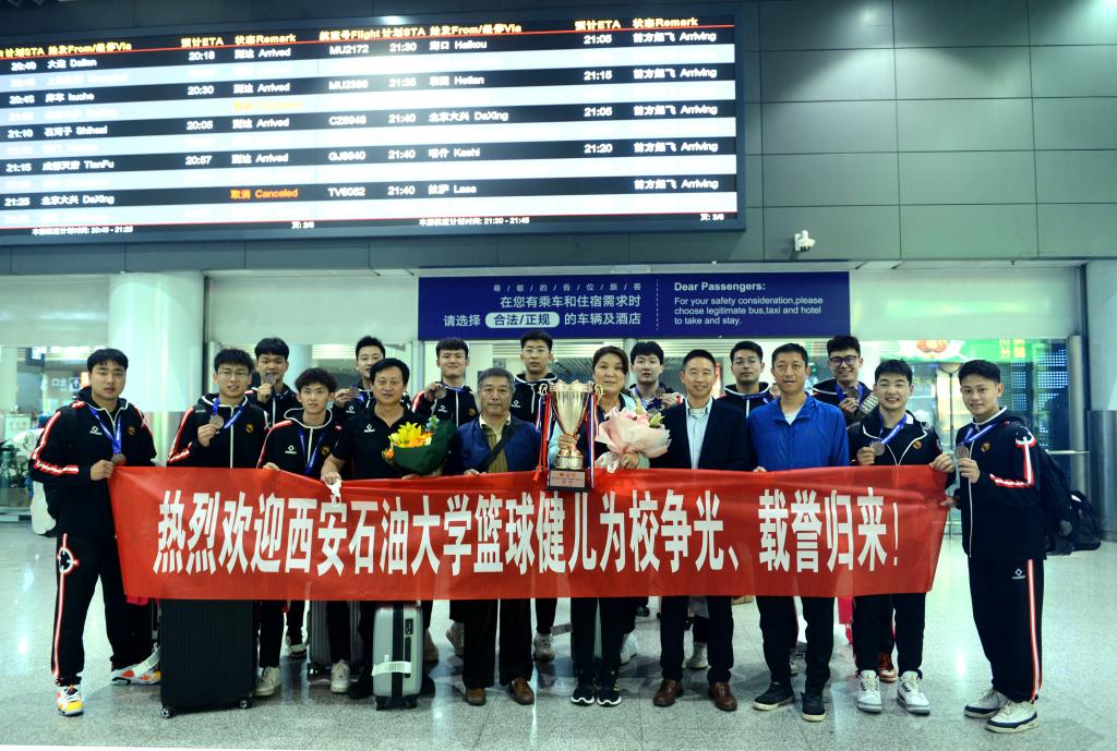 據(jù)悉,當(dāng)天下午,體育學(xué)院倪振文、李壽邦一行前往西安咸陽(yáng)國(guó)際機(jī)場(chǎng)接機(jī),晚上10:20左右接機(jī)大巴車到達(dá)雁塔校區(qū)?!盁崃覛g迎西安石油大學(xué)籃球健兒為校爭(zhēng)光、載譽(yù)歸來(lái)!”歡迎儀式從隊(duì)員下車開(kāi)始,獻(xiàn)花隊(duì)伍為每名教練組成員和隊(duì)員獻(xiàn)上鮮花。