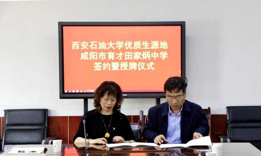會(huì)上,雙方簽訂了“西安石油大學(xué)優(yōu)秀生源基地”協(xié)議書(shū),王君萍代表學(xué)校向咸陽(yáng)市育才田家炳中學(xué)授牌。