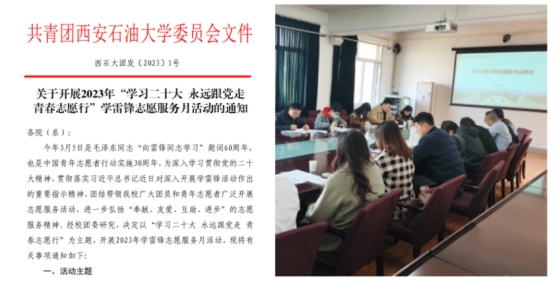 一是發(fā)揮共青團(tuán)的組織優(yōu)勢,面向全校青年學(xué)生發(fā)布《關(guān)于開展2023年“學(xué)習(xí)二十大 永遠(yuǎn)跟黨走 青春志愿行”學(xué)雷鋒志愿服務(wù)月活動的通知》,在學(xué)校各級團(tuán)組織集中開展為期一個月的“學(xué)雷鋒”志愿服務(wù)活動,活動范圍覆蓋關(guān)愛留守兒童、鄉(xiāng)村振興、助殘助老、生態(tài)環(huán)保、文明校園等方面。二是理論聯(lián)系實(shí)際,推動工作提質(zhì)增效,組織各院系團(tuán)委書記、團(tuán)支部書記學(xué)習(xí)習(xí)近平總書記對深入開展學(xué)雷鋒活動的重要指示精神,并結(jié)合實(shí)際對在我校如何推進(jìn)“學(xué)雷鋒”志愿服務(wù)工作取得實(shí)效進(jìn)行了研討和工作部署。三是推進(jìn)志愿服務(wù)工作組織規(guī)范化建設(shè),推薦教師和學(xué)生代表參加3月25日舉行的陜西省青年志愿者協(xié)會第五次會員代表大會,推薦我校青年志愿者協(xié)會入選“陜西省青年志愿者協(xié)會理事單位”。