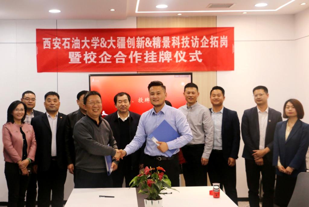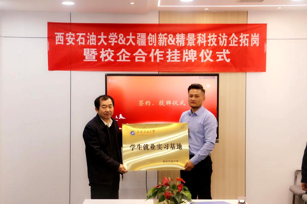 在與會人員共同見證下,舉行了精景科技公司和西安石油大學(xué)聯(lián)合培養(yǎng)暨校外實習(xí)基地簽約儀式及校企合作掛牌儀式。李天太為企業(yè)掛牌,張愈和譚成仟代表雙方簽約。