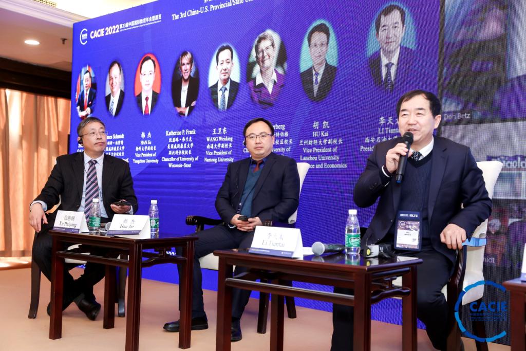 作為本屆年會的重要組成部分,第三屆中美省州大學校長論壇以線上+線下形式舉行,來自170多所中美高校的代表出席,邀請中美12所高校的校長作為發(fā)言和研討嘉賓。我校校長李天太是陜西高校唯一特邀論壇嘉賓。論壇主題為探索中美省州大學產教融合新模式,提高國際化人才培養(yǎng)質量,服務地方經濟社會新發(fā)展。論壇研討內容包括以中美學分互認、學位聯(lián)授項目為基礎,以國際化人才培養(yǎng)為紐帶,構建高水平、寬領域、可持續(xù)的中美省州高校合作交流平臺。通過教育國際交流打造適應國家發(fā)展需求的新工科、新農科、新商科等高質量專業(yè)學科群,建設具有國際化水平的師資隊伍,加強中美高校之間學術科研合作,通過產教融合模式強化合作共贏理念,推進中美省州高校教育交流、人才培養(yǎng)、校企合作、科研合作、人文交流等,為地方經濟社會發(fā)展服務。
