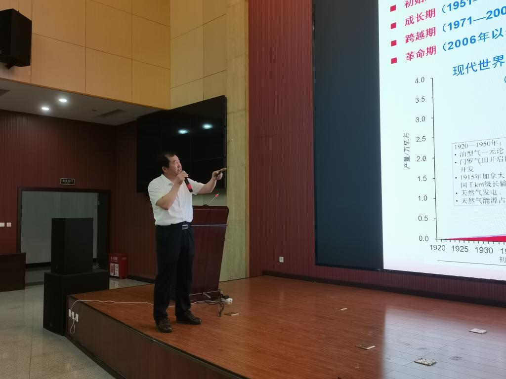在授課中,李天太首先圍繞習近平總書記對國家能源安全作出的批示指示精神、國家“雙碳“目標和世界能源格局等方面,向在場師生介紹了學校成立新能源學院、土木工程學院的背景以及必要性。隨后分別介紹了世界油氣發(fā)展趨勢和我國油氣發(fā)展趨勢。他以人類社會發(fā)展為主線,以能源科技革命為人類社會發(fā)展提供不竭新動力為切入點,通過詳實的數(shù)據(jù)和大量的圖表詳細闡述了世界油氣發(fā)展趨勢和我國油氣發(fā)展趨勢,強調(diào)在我國目前能源戰(zhàn)略和結(jié)構(gòu)體系下,新能源將發(fā)揮保障國家能源戰(zhàn)略“接替”與“主力”作用。最后,李天太結(jié)合自己30余年能源行業(yè)工作學習感悟,對新能源發(fā)展趨勢作出展望。他希望新能源學院、土木工程學院的廣大學子樹立遠大理想,努力學習、不負韶華,爭取為保障國家能源戰(zhàn)略安全作出貢獻。