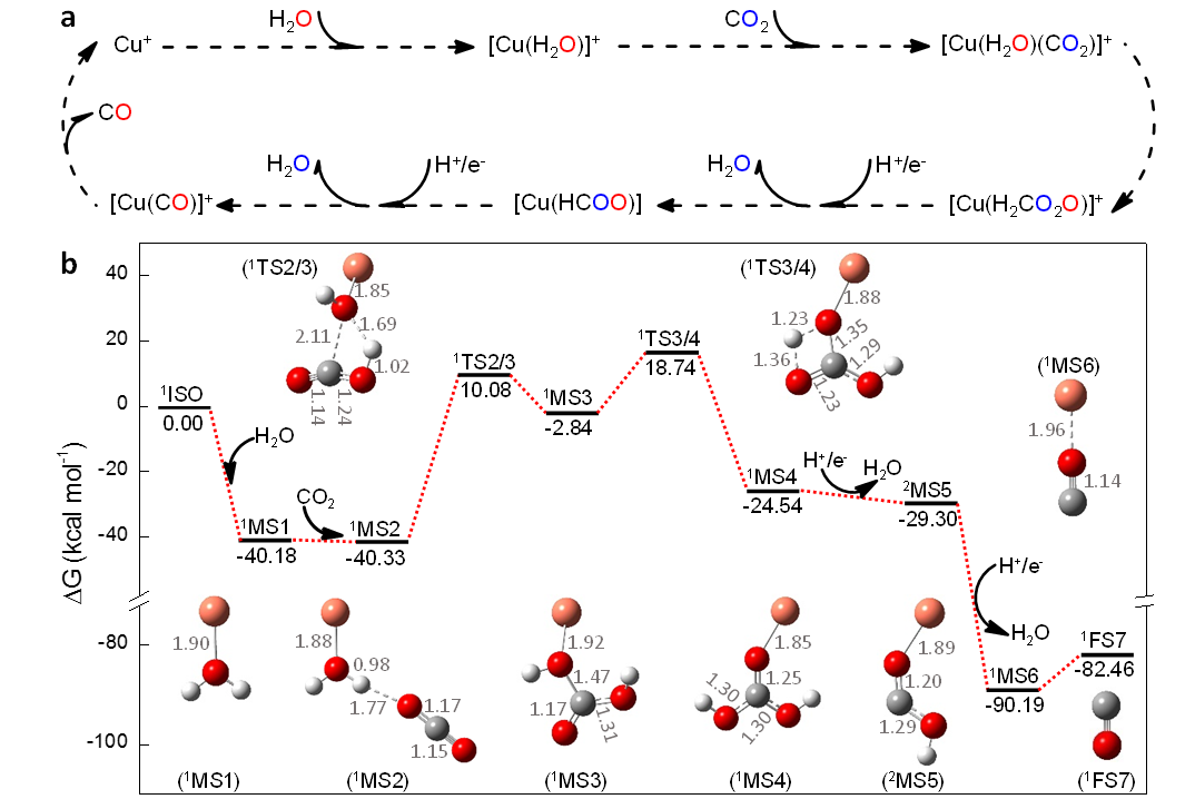 按照傳統(tǒng)觀點,二氧化碳還原轉化為一氧化碳中的O原子來自二氧化碳。該研究中,科研人員發(fā)現(xiàn)還原反應生成一氧化碳中的O原子來自反應體系催化劑表面的配位水分子,而非二氧化碳本身。該結論不僅適用于質在線反應過程,也適用于實際二氧化碳的電催化還原反應和工業(yè)化水煤氣逆反應過程,說明該發(fā)現(xiàn)具有一定的普適性。同時發(fā)現(xiàn)相比于金屬催化劑Cu+,當[Cu(H2O)]+作為催化劑時,二氧化碳還原為一氧化碳的反應效率可提高兩個數(shù)量級。為了深入探究該反應過程,科研人員通過改造質譜儀對反應中間體的捕獲、同位素對比實驗和密度泛函理論的計算,詳細闡述了二氧化碳在[Cu(H2O)]+催化作用下生成一氧化碳的機制。該工作不僅為深入闡述二氧化碳還原機理提供了方法學基礎,也為詳細了解水在二氧化碳還原過程中的作用提供了著眼點。