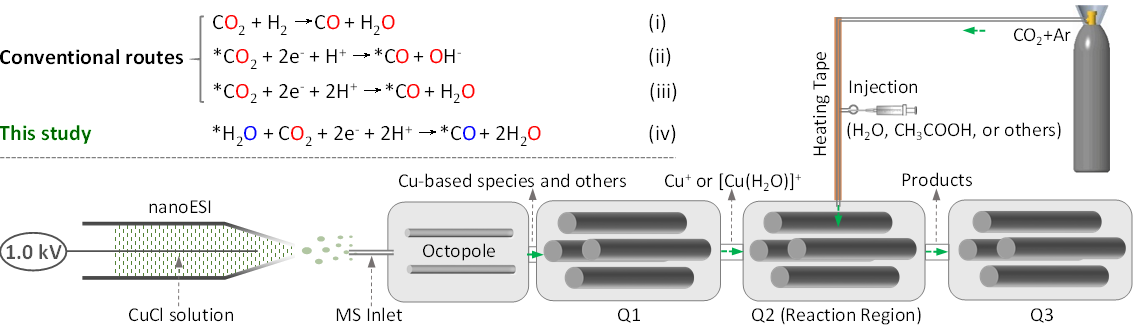 近日,我?;瘜W化工學院張智平教授團隊在二氧化碳還原反應機理研究方面取得了重要進展,相關工作發(fā)表在《自然-通訊》(Nat. Commun.2022, 13, 2577)。本工作中,研究人員通過對商品儀器的改造,巧妙地將三重四極質譜儀第一級四極桿作為特定催化劑離子的實時分離器、第二級四極桿作為二氧化碳還原過程的微反應器、第三級四極桿將反應涉及的中間體和產物在線傳遞到檢測器中,采用同位素標記化合物作為反應的示蹤劑,通過對質譜儀氣路系統(tǒng)的特殊設計,直接將常壓電離源電離的催化劑銅離子及其配合物離子分離出來與二氧化碳氣體在線相互作用,通過對各種實驗條件下反應中間體及產物的在線捕獲及同位素對比實驗,詳細闡釋了二氧化碳還原為一氧化碳的反應機理。