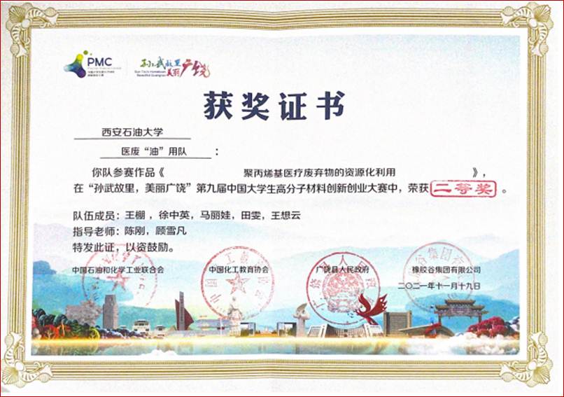 基于該課題的研究工作,已經先后獲得第十四屆全國大學生節(jié)能減排社會實踐與科技競賽三等獎、第九屆中國大學生高分子材料創(chuàng)新創(chuàng)業(yè)大賽二等獎。