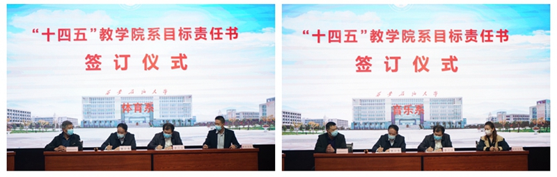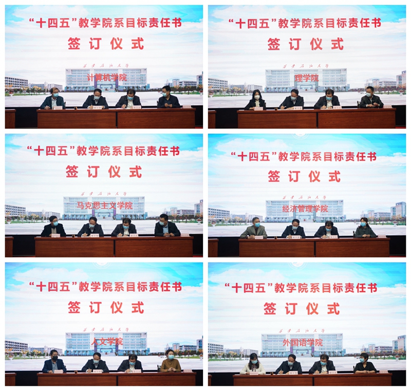 會(huì)議首先由校黨委書記賽云秀和校長李天太與各院(系)書記、院長簽訂“十四五”事業(yè)發(fā)展規(guī)劃目標(biāo)責(zé)任書。院系 “十四五”目標(biāo)責(zé)任書從黨建與文化建設(shè)、學(xué)科專業(yè)、人才培養(yǎng)、師資隊(duì)伍、科學(xué)研究、合作與交流等不同維度明晰了院系“十四五”建設(shè)目標(biāo)與任務(wù)。