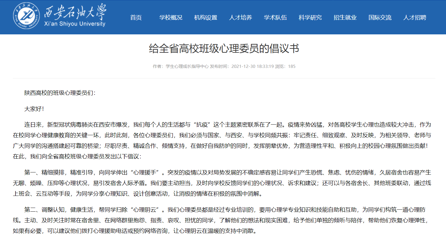 1216日學(xué)校黨委安排部署疫情防控工作以來(lái),黨委學(xué)生工作部、研究生工作部密切聯(lián)動(dòng),各院(系)黨委(總支)積極配合,迅速啟動(dòng)學(xué)生工作干部24小時(shí)在崗、鄠邑校區(qū)每周輪值等工作制度,確保一線(xiàn)工作力量充足,全方位有序做好思想教育引導(dǎo)、政策法律宣傳、衛(wèi)生防疫知識(shí)學(xué)習(xí)等工作。