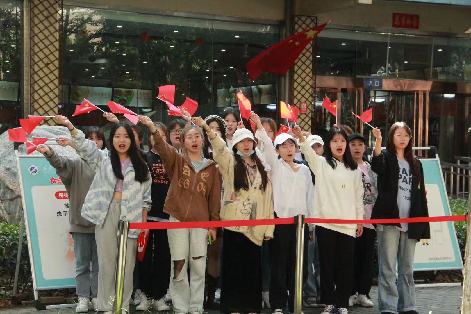 中午12點(diǎn)10分,紅歌快閃活動正式開始,首先以小合唱和歌伴舞演繹了《我和我的祖國》。在優(yōu)美的旋律中,手持紅旗的師生們集體合唱了《紅星閃閃》、《輝煌明天》兩首歌曲,用歌聲抒發(fā)心中愛國熱忱?;顒釉趲熒鷤儭拔以谖靼彩痛髮W(xué)祝祖國生日快樂!”的歡呼聲中圓滿結(jié)束。