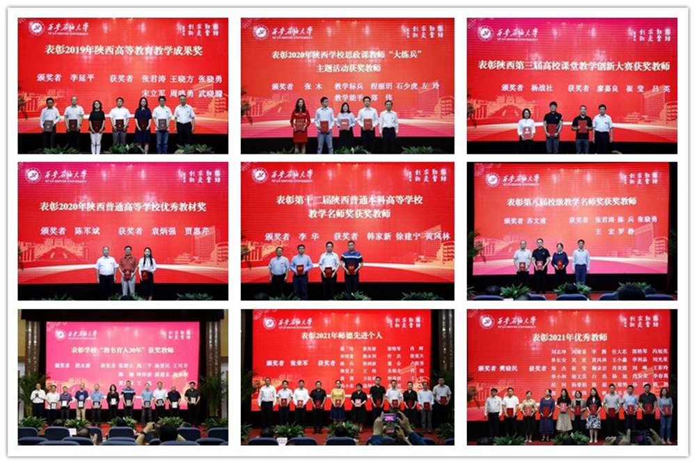 會上,校黨委書記賽云秀宣讀了《陜西省總工會關于表彰2020年陜西省五一勞動獎和陜西省工人先鋒號的決定》,并為五一勞動獎章獲得者周靜老師頒獎;校長李天太宣讀了《陜西省人力資源和社會保障廳關于我省 2020 年享受政府特殊津貼人員的通知》,并為入選者周德勝老師頒獎;校黨委副書記、紀委書記、監(jiān)察專員李延平宣讀了《陜西省人民政府辦公廳關于表彰2019年高等教育教學成果獎獲獎項目的通報》,并為張君濤、王曉方、張驍勇、宋立軍、周鳴勇、武曉朦6位老師領獎;校黨委副書記張木宣讀了《中共陜西省委教育工委陜西省教育廳關于表彰2020年陜西學校思政課教師“大練兵”主題活動獲獎教師的決定》,并為程麗玥、石少虎、左玲、鄭偉4位老師領獎;副校長楊戰(zhàn)社宣讀了《陜西省教育廳關于表彰陜西第三屆高校課堂教學創(chuàng)新大賽獲獎教師的決定》,并為廖嘉良、崔瑩、呂英3位老師頒獎;副校長陳軍斌宣讀了《陜西省教育廳辦公室關于公布2020年陜西普通高等學校優(yōu)秀教材獲獎名單的通知》,并為袁炳強、賈惠芹2位老師頒獎;副校長李華宣讀了《陜西省教育廳關于表彰第十二屆陜西普通本科高等學校教學名師獎獲獎教師的通知》,并為韓家新、徐建寧、黃風林3位老師頒獎;副校長蘇文甫宣讀了《西安石油大學關于公布第八屆校級教學名師獎評選結(jié)果的通知》,并為獲獎老師頒獎;副校長程永清宣讀了《西安石油大學關于表彰獎勵“教書育人30年”教師的決定》,并為張群正、周三平、楊愛民、王可升、陳楠、鐘澤波 、郝建東、高永利、黃風林、王嵐等10位老師頒獎;副校長張榮軍宣讀了《中共西安石油大學委員會 西安石油大學關于表彰2021年師德建設先進集體和師德先進個人的決定》,并為獲獎單位和先進個人代表頒獎;總會計師樊曉民宣讀了《中共西安石油大學委員會 西安石油大學關于表彰2021年優(yōu)秀教師 先進教育工作者的決定》,并為獲獎教師代表頒獎。