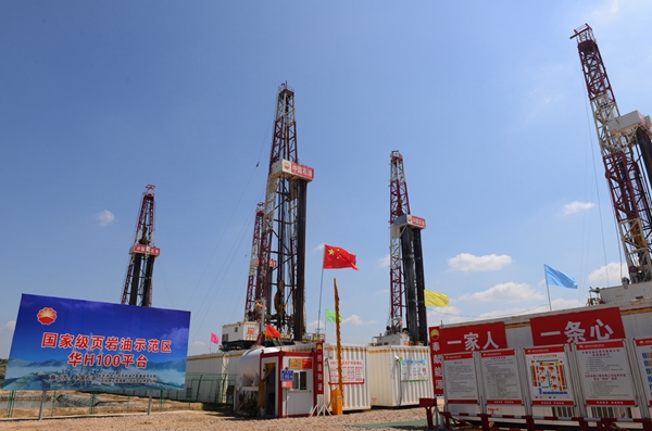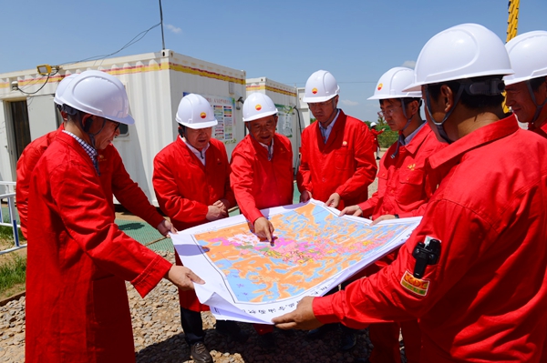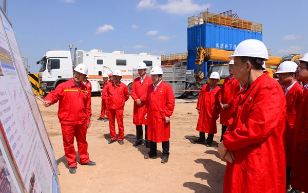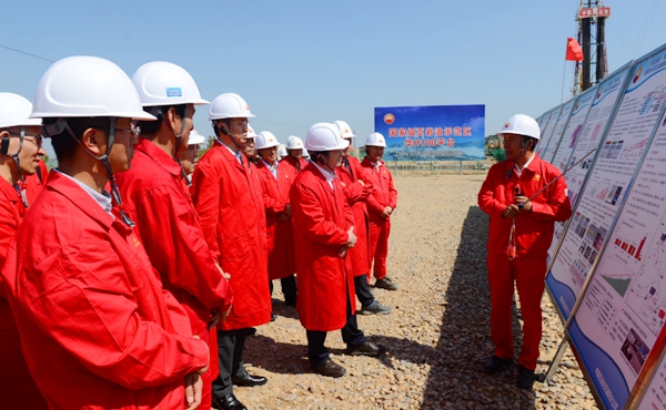 李校長(zhǎng)一行首先參觀了位于甘肅省慶陽(yáng)市慶城縣的隴東國(guó)家級(jí)頁(yè)巖油示范區(qū)華H100平臺(tái)。隴東國(guó)家級(jí)頁(yè)巖油示范區(qū)是長(zhǎng)慶油田二次加快發(fā)展、推動(dòng)油氣持續(xù)上產(chǎn)的重要接替區(qū)域,頁(yè)巖油產(chǎn)能建設(shè)項(xiàng)目組以規(guī)模建產(chǎn)、效益開發(fā)、綠色生產(chǎn)、技術(shù)攻關(guān)為導(dǎo)向,加大前端技術(shù)研究分析,強(qiáng)化生產(chǎn)組織,把控關(guān)鍵環(huán)節(jié),全力推進(jìn)頁(yè)巖油高效勘探開發(fā)。華H100平臺(tái)通過深化地質(zhì)研究,精細(xì)小層對(duì)比,優(yōu)選平面、縱向“甜點(diǎn)”,全部實(shí)現(xiàn)大井叢部署。目前,該平臺(tái)實(shí)行工廠化作業(yè),5部鉆機(jī)快速鉆進(jìn),計(jì)劃在6月底全部完鉆部署任務(wù),為中國(guó)共產(chǎn)黨百年華誕獻(xiàn)禮。