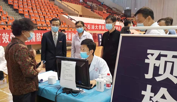 校黨委副書記張木、副校長蘇文甫在疫苗接種現(xiàn)場,聽取了疫苗接種工作有關(guān)情況匯報(bào),詳細(xì)詢問了預(yù)約接種流程安排,看望慰問正在進(jìn)行疫苗接種的工作人員和師生。