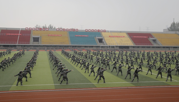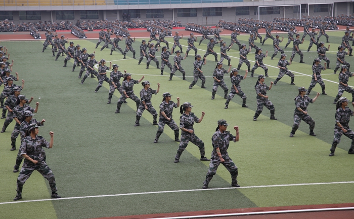 伴隨著激昂的進(jìn)行曲和嘹亮的口號(hào),2020級(jí)本科生分12個(gè)方陣,邁著整齊矯健的步伐,精神飽滿地經(jīng)過(guò)主席臺(tái),向全校師生展示隊(duì)列訓(xùn)練成果。隊(duì)列成果展示后,2020級(jí)本科新生分別進(jìn)行了捕俘刀、軍體拳、刺殺操、手語(yǔ)操等科目的表演。