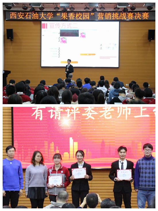 3.增強(qiáng)愛國(guó)主義教育,舉辦扶貧類專業(yè)競(jìng)賽。11月18日晚,“守初心、擔(dān)使命,師生融合助扶貧——西安石油大學(xué)首屆‘果香校園’營(yíng)銷挑戰(zhàn)賽決賽”在鄠邑校區(qū)經(jīng)管人文樓118多功能廳成功舉辦。時(shí)值“不忘初心、牢記使命”主題教育,校團(tuán)委和經(jīng)濟(jì)管理學(xué)院將立德樹人落實(shí)到具體行動(dòng),積極促成本次活動(dòng);企業(yè)管理系教工黨支部和企業(yè)管理系學(xué)生黨支部充分發(fā)揮師生融合力,由該系老師作為指導(dǎo)教師,該系學(xué)生黨支部協(xié)同營(yíng)銷協(xié)會(huì)作為活動(dòng)的組織者,守初心、擔(dān)使命,為全校同學(xué)帶來了一次鮮活生動(dòng)的思想政治教育和專業(yè)建設(shè)活動(dòng)?;顒?dòng)共吸引全校400多名同學(xué),積極獻(xiàn)計(jì)獻(xiàn)策,通過實(shí)踐活動(dòng)服務(wù)三農(nóng),助力扶貧,彰顯了我校青年學(xué)子愛國(guó)愛家的優(yōu)秀品質(zhì)。據(jù)悉,本次比賽,歷時(shí)一個(gè)月左右,共有來自全校434名同學(xué)報(bào)名參賽。參加決賽的12支團(tuán)隊(duì),共銷售蘋果1673余箱,為當(dāng)?shù)毓r(nóng)增收100380元。