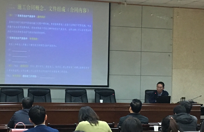 專題講座上,徐雷教授圍繞建筑工程合同管理中的合同概述、施工合同概念文件組成、施工合同的特點、施工合同風險識別障礙、施工合同索賠問題以及施工合同管理方法建議等六個方面,進行了詳細地講解。講座中穿插了大量的實際案例,具有較強的針對性和實踐性。講座結束后與會人員積極向徐教授提問請教,現(xiàn)場氣氛熱烈。