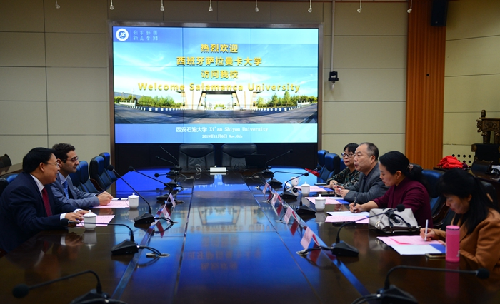 陳軍斌副校長對(duì)何塞·米格爾先生一行來訪表示歡迎,并介紹了學(xué)校的發(fā)展歷史和基本情況。他談到,為滿足中石油、中石化等企業(yè)在海外開展業(yè)務(wù)的需求,我校從1997年就開展了西班牙語的培訓(xùn)工作。隨著中國改革開放的深入和“一帶一路”倡議的實(shí)施,大批中國石油石化企業(yè)在南美西班牙語國家拓展業(yè)務(wù),急需大量西班牙語人才。我校是中國西北地區(qū)唯一一所以石油石化為特色的高等學(xué)校,在我校成立薩拉曼卡大學(xué)西班牙語學(xué)院具有重要意義,可以培養(yǎng)既懂專業(yè)技術(shù)又通曉西班牙語的復(fù)合型人才,服務(wù)于國家經(jīng)濟(jì)發(fā)展的需要和“一帶一路”倡議需求。他希望兩校以此為平臺(tái)開展全方位的合作,不僅僅局限于語言培訓(xùn),還要積極開展西班牙語及西班牙文化的研究,提升我校與西班牙教育合作交流的水平。
