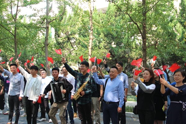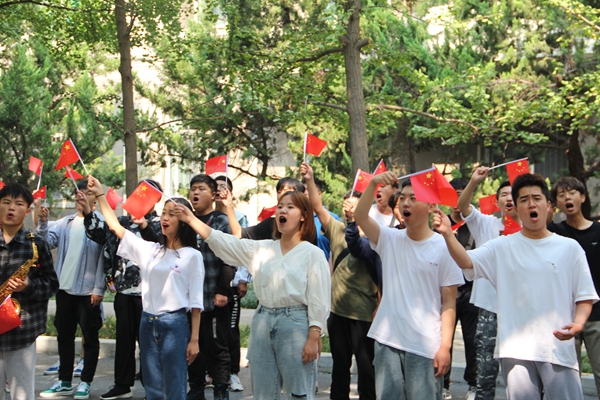 中午11時(shí)45分,音樂(lè)系100余名師生匯聚到雁塔校區(qū)學(xué)生餐廳門外。隨著聲樂(lè)教研室主任田立老師的現(xiàn)場(chǎng)伴奏,大家一邊揮舞著五星紅旗,一邊唱起了歌曲《我和我的祖國(guó)》《歌唱祖國(guó)》。這兩首慷慨激昂、振奮人心的經(jīng)典紅色歌曲,表達(dá)了我校師生對(duì)祖國(guó)的崇敬和熱愛(ài),展示了我校師生積極向上的精神風(fēng)貌。師生們通過(guò)“快閃”這樣的新穎形式,唱響了共產(chǎn)黨好、社會(huì)主義好、改革開(kāi)放好、偉大祖國(guó)好的主旋律,令人耳目一新,贏得了在場(chǎng)師生的陣陣掌聲。