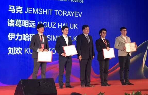 此次交流會(huì)上,我校土庫(kù)曼斯坦留學(xué)生馬克獲“一帶一路”教育傳播大使獎(jiǎng),省教育廳廳長(zhǎng)王建利為他頒發(fā)證書(shū)。