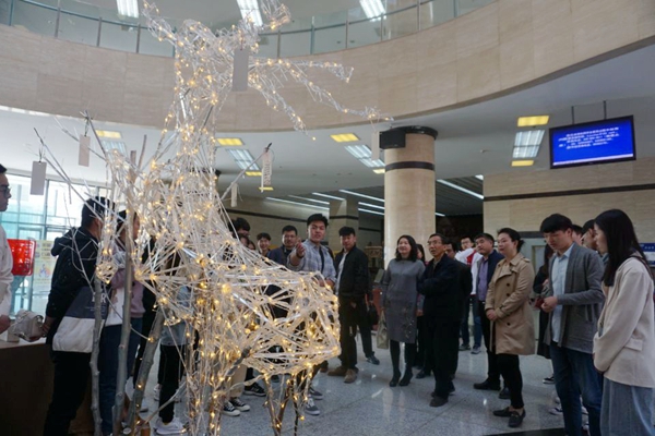 本屆《公共藝術設計》課程作品展以“啟迪思想、陶冶人生”為主題,展出由人文學院設計系張瑞平教師指導2016級環(huán)境設計專業(yè)學生完成的課程實踐作品。共展出31組室內外公共藝術設計作品,由裝置藝術、浮雕、綜合材料藝術等類型組成,分布在鄠邑校區(qū)二樓圖書館及圖書館周邊花園、草坪等相關區(qū)域。