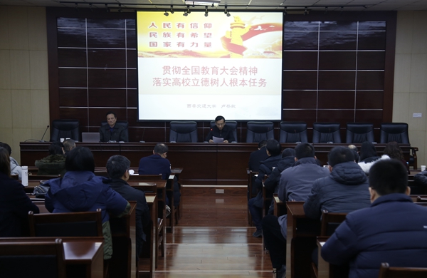 盧黎歌教授以《貫徹全國教育大會精神 落實高校立德樹人根本任務(wù)》為題,從“充分理解全國教育大會的歷史意義”、“認真領(lǐng)會全國教育大會精神”、“結(jié)合我省實際重在貫徹落實”三個方面對全國教育大會精神進行了全面宣講和精細解讀。