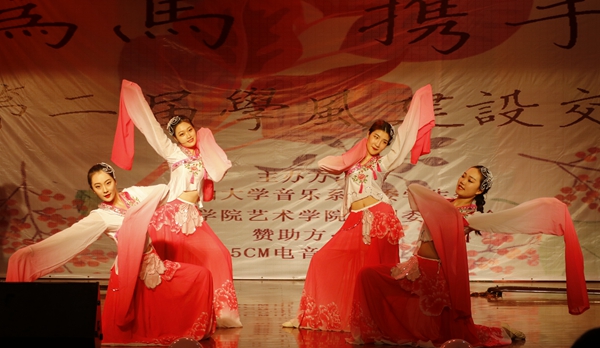 晚會首先由西安文理學院器樂合奏《奇跡》拉開序幕,讓人們遠離都市喧囂,傾聽自然的旋律;我校學生深情演唱的《絨花》,歌頌了英勇偉大的革命先烈,抒發(fā)了對他們的真摯緬懷;由我校何云老師編排的古典舞《古韻琴聲》優(yōu)美婉約,古典大氣;《愛情廢柴》《All I ask of you》等歌曲旋律優(yōu)美,節(jié)奏歡快;街舞《come baby come》、T臺秀、大合唱《友誼天長地久》將晚會推向了高潮,晚會在全場同學的掌聲中圓滿落下帷幕。