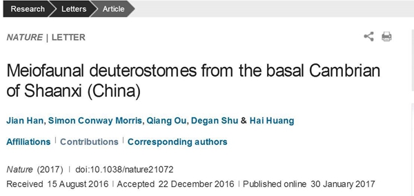 倫敦當(dāng)?shù)貢r(shí)間1月30日16時(shí)(北京時(shí)間1月31日0時(shí))在線提前出版的英國《Nature》(自然)雜志,以封面亮點(diǎn)文章的形式,發(fā)表了我校石油工程學(xué)院黃海副教授與西北大學(xué)早期生命研究團(tuán)隊(duì)、劍橋大學(xué)、中國地質(zhì)大學(xué)(北京)等單位合作研究的重要成果——《陜西寒武紀(jì)最早期的微型后口動(dòng)物》。