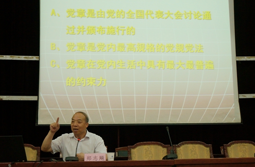 鄭志飚教授從黨章的時(shí)代價(jià)值意義、黨章的主要精神內(nèi)容和按黨章要求做合格黨員等三個(gè)方面,回答了為什么學(xué)黨章、學(xué)黨章學(xué)什么、學(xué)黨章后怎么做等三個(gè)問題。報(bào)告以問題為導(dǎo)向,深入淺出、主題鮮明,為黨員干部上了一節(jié)生動(dòng)的黨課,使黨員干部的思想認(rèn)識(shí)得到了進(jìn)一步的提高,對(duì)于深刻把握黨章內(nèi)涵、提升學(xué)習(xí)效果具有很強(qiáng)的針對(duì)性,對(duì)于我校進(jìn)一步深入開展“兩學(xué)一做”學(xué)習(xí)教育具有積極的促進(jìn)作用。