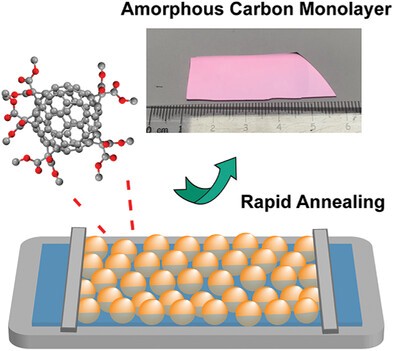 通過常壓下可控?zé)峤飧焕障┛梢垣@得介于富勒烯型碳和石墨烯型碳之間的新型碳材料(Nature,2022, 606, 507)。經(jīng)過斷裂交聯(lián)過程,富勒烯籠之間形成了納米孔結(jié)構(gòu)。但受限于制備方式,所剝離的單層膜一般為微米尺寸,較難進行膜性質(zhì)研究。