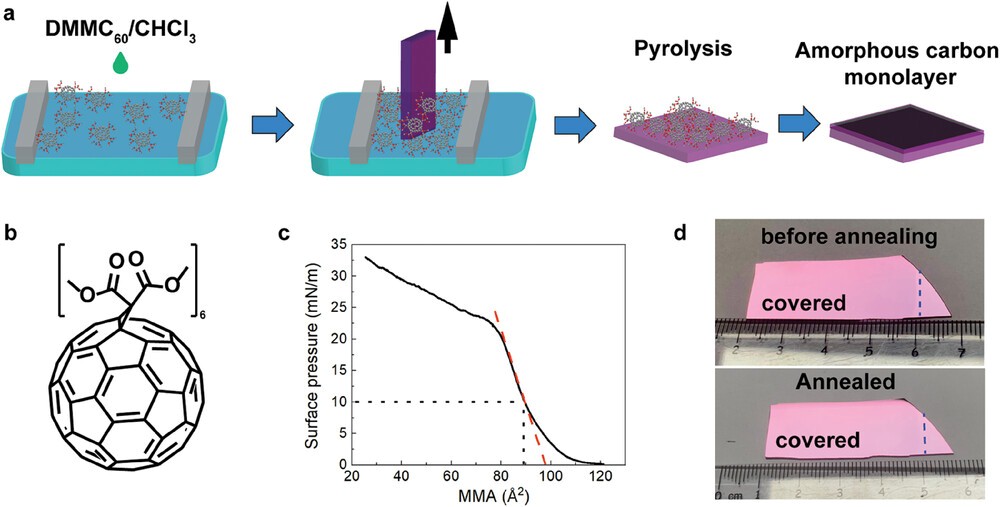 本研究中以改性的富勒烯單體為前驅(qū)體,通過Langmuir-Blodgett制膜-快速熱解兩步法制備了厘米尺寸的單層多孔非晶碳膜。研究證明其為亞穩(wěn)態(tài)結(jié)構(gòu)且不導(dǎo)電。此外,離子跨膜傳輸研究表明該膜具有陽離子選擇性(選擇性為26%)。這項工作對單層多孔非晶碳膜的可控制備具有指導(dǎo)意義。