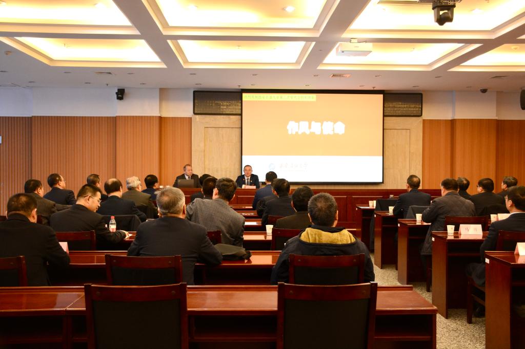 參觀結(jié)束后,全體同志來(lái)到圖書館第一會(huì)議室。校鐵人精神研究中心研究員郭崗彥為大家作《作風(fēng)與使命》專題報(bào)告,校黨委書記常江主持報(bào)告會(huì)。郭崗彥深入講解了延安整風(fēng)所取得的明顯成效以及作為作風(fēng)建設(shè)源頭活水的重大意義,介紹了大慶石油會(huì)戰(zhàn)靠“兩論”起家、“兩分法”前進(jìn)的背景和效果,用生動(dòng)的故事、躬身研究的珍藏,深刻闡釋了大慶精神的歷史定位、豐富內(nèi)涵和時(shí)代價(jià)值,展現(xiàn)了石油人縱橫千里、叱咤油田的恢弘氣勢(shì)和英雄形象。他進(jìn)一步講解了大慶會(huì)戰(zhàn)對(duì)加強(qiáng)作風(fēng)建設(shè)的高度重視,介紹了對(duì)干部工作作風(fēng)“三個(gè)面向”“五到現(xiàn)場(chǎng)”“約法三章”的基本要求,對(duì)工人工作作風(fēng)“四個(gè)一樣”“三老四嚴(yán)”的基本要求,引用余秋里關(guān)于“培養(yǎng)作風(fēng)實(shí)際上就是培養(yǎng)隊(duì)伍戰(zhàn)斗力”的論述,展開闡述了“嚴(yán)細(xì)準(zhǔn)狠”的關(guān)鍵作用。