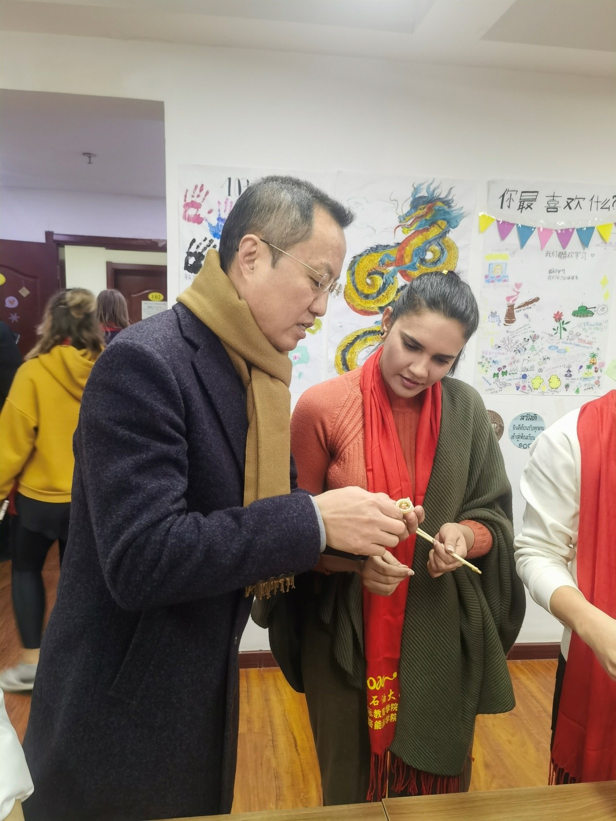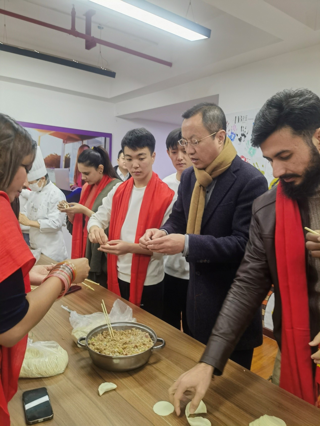 在“品味中國年”包餃子環(huán)節(jié),張榮軍與在場留學生一起包餃子,親自示范如何包餃子,國際學生公寓一派歡樂祥和節(jié)日氛圍,師生共慶中國龍年到來。
