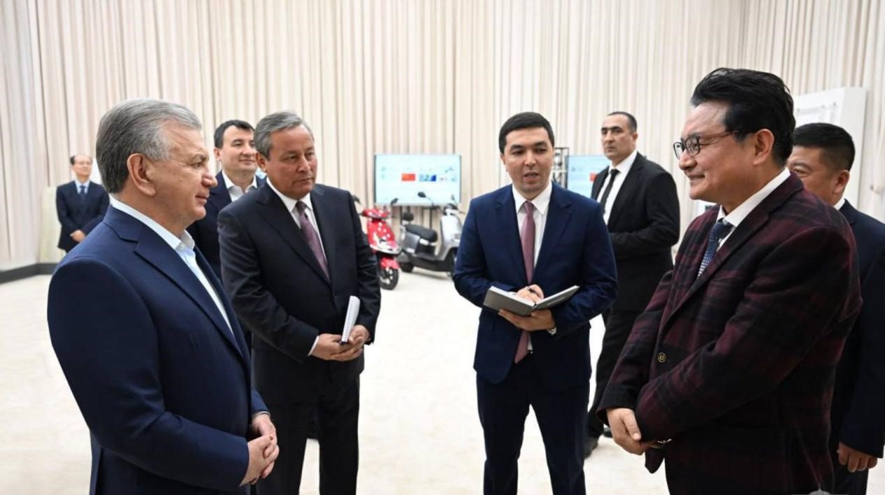 烏茲別克斯坦總統(tǒng)米爾濟(jì)約耶夫(左一)考察安集延州工業(yè)園區(qū)并接見赴安集延州商務(wù)考察團(tuán)中方企業(yè)代表