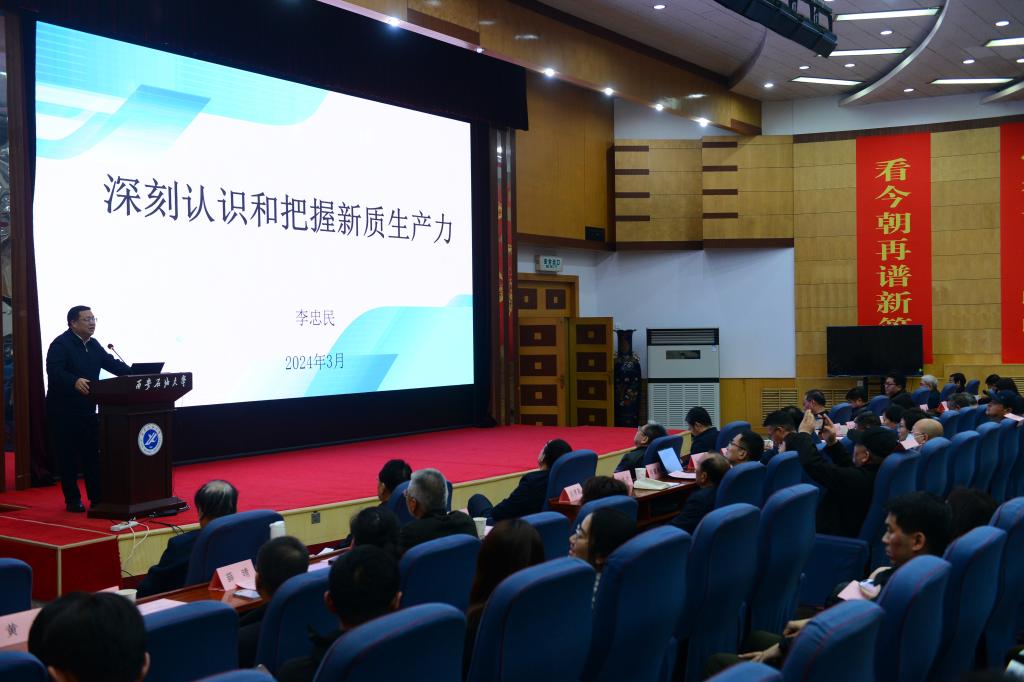 李忠民領(lǐng)學了習近平總書記在全國兩會期間的重要講話精神,就如何深刻把握因地制宜發(fā)展新質(zhì)生產(chǎn)力,從馬克思主義生產(chǎn)力理論、世界生產(chǎn)力發(fā)展概況、深刻認識把握新質(zhì)生產(chǎn)力、因地制宜發(fā)展新質(zhì)生產(chǎn)力四個方面作了專題報告。李忠民表示,新質(zhì)生產(chǎn)力特點是創(chuàng)新,關(guān)鍵在質(zhì)優(yōu),本質(zhì)是先進生產(chǎn)力。發(fā)展新質(zhì)生產(chǎn)力就是要積極培育新能源、新材料、先進制造、電子信息等戰(zhàn)略性新興產(chǎn)業(yè),積極培育未來產(chǎn)業(yè),因地制宜加快發(fā)展新質(zhì)生產(chǎn)力,增強發(fā)展新動能。要深入學習領(lǐng)會習近平總書記重要講話和全國兩會精神,深刻把握當前國際國內(nèi)形勢,深刻領(lǐng)會因地制宜發(fā)展新質(zhì)生產(chǎn)力、全面深化改革開放、促進區(qū)域協(xié)調(diào)發(fā)展、加強生態(tài)文明建設(shè)、形成推動發(fā)展強大合力的重要內(nèi)涵,在奮力譜寫陜西新篇、爭做西部示范中展現(xiàn)新作為。