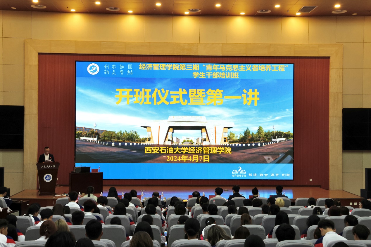 為深入學習貫徹習近平新時代中國特色社會主義思想和黨的二十大精神,提高青年學生的馬克思主義理論素養(yǎng)和實踐能力,引領(lǐng)廣大青年做有理想、敢擔當、能吃苦、肯奮斗的新時代好青年,4月7日晚,經(jīng)濟管理學院第三期“青年馬克思主義者培養(yǎng)工程”學生干部培訓班開班儀式暨第一講在鄠邑校區(qū)弘石學術(shù)報告廳順利舉辦。校黨委副書記張木出席開班儀式并作專題輔導報告。經(jīng)濟管理學院黨委書記談建勤,全體學生工作干部以及學生干部400余人參加培訓班開班儀式暨第一講。開班儀式由經(jīng)濟管理學院黨委副書記王剛主持。
