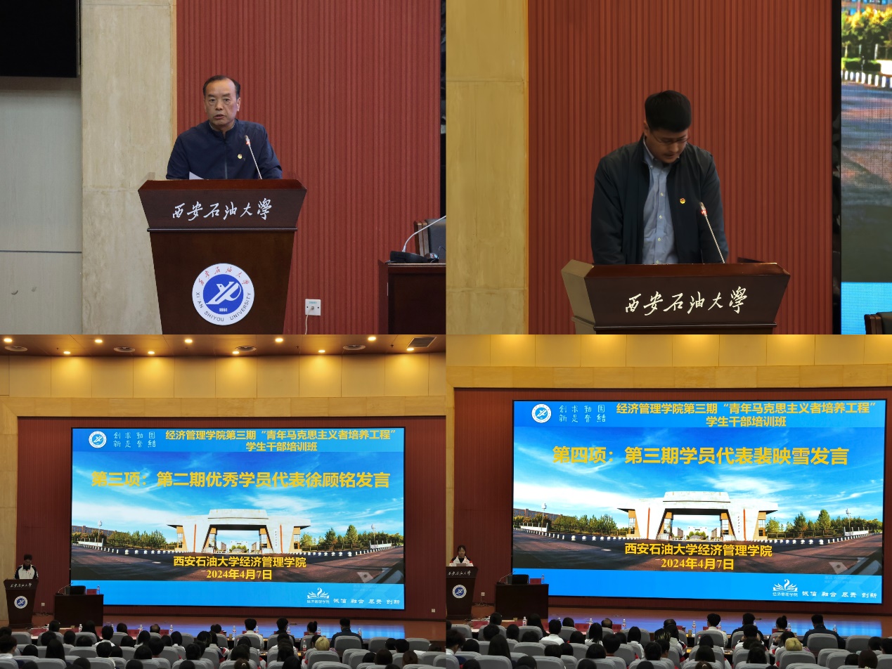 談建勤在總結(jié)時指出,廣大青年學生干部應(yīng)當發(fā)揮先鋒作用,踐行鐵人精神,汲取前進力量,努力做黨的事業(yè)的忠誠擁護者和堅定實踐者。他希望與會學生干部要仰望星空、腳踏實地,向善向上、陽光自信,勇立潮頭、勇爭第一。學院團委書記李博文宣讀了本期培訓班的培訓通知及考核要求,學院第二期培訓班優(yōu)秀學員代表徐顧銘與第三期培訓班學員代表裴映雪分別發(fā)言。