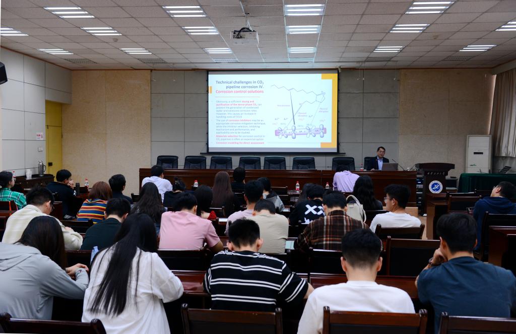 會(huì)見前,程玉峰院士在雁塔校區(qū)會(huì)議中心第三會(huì)議室,為相關(guān)專業(yè)師生作了“CCUS技術(shù)的二氧化碳管道發(fā)展及內(nèi)腐蝕預(yù)測”的學(xué)術(shù)報(bào)告。程院士以“二氧化碳管道的全球分布”為切入點(diǎn),概述了能源管道技術(shù)中的材料創(chuàng)新,包括氫氣脆化研究中的氣態(tài)氫-鐵原子相互作用,輸氫管道技術(shù),CO2管道和儲(chǔ)罐超臨界條件,電化學(xué)腐蝕和應(yīng)力腐蝕開裂(SCC),腐蝕管理中的機(jī)器學(xué)習(xí)方法,管道性能評(píng)估、故障和對環(huán)境的影響。他重點(diǎn)講述了CCUS技術(shù)、CCUS管道的發(fā)展、CO2管道的設(shè)計(jì)與技術(shù)挑戰(zhàn)及CO2管道的內(nèi)部腐蝕。程院士提出了超臨界CO2腐蝕的新模型及CO2管道的五項(xiàng)技術(shù),包括特定的工作壓力范圍和壓降,以避免不必要的相位變化;由含水量和其他雜質(zhì)引起的腐蝕緩解和監(jiān)測問題;具體的材料考慮,以盡量減少運(yùn)行裂縫的風(fēng)險(xiǎn);應(yīng)急響應(yīng)計(jì)劃和分散建模考慮;管道運(yùn)行期間將采取的安全預(yù)防措施。