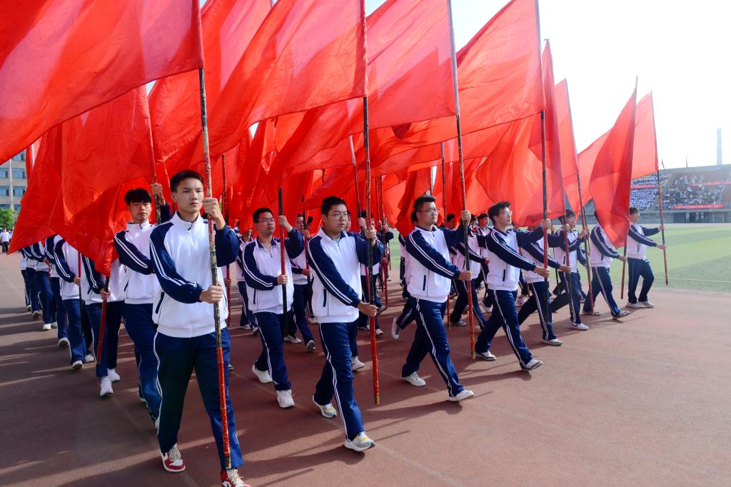 入場(chǎng)儀式完畢,全場(chǎng)起立。在雄壯的國(guó)歌聲中,大會(huì)舉行了莊嚴(yán)的升旗儀式,隨著五星紅旗冉冉升起,全場(chǎng)師生齊唱國(guó)歌。