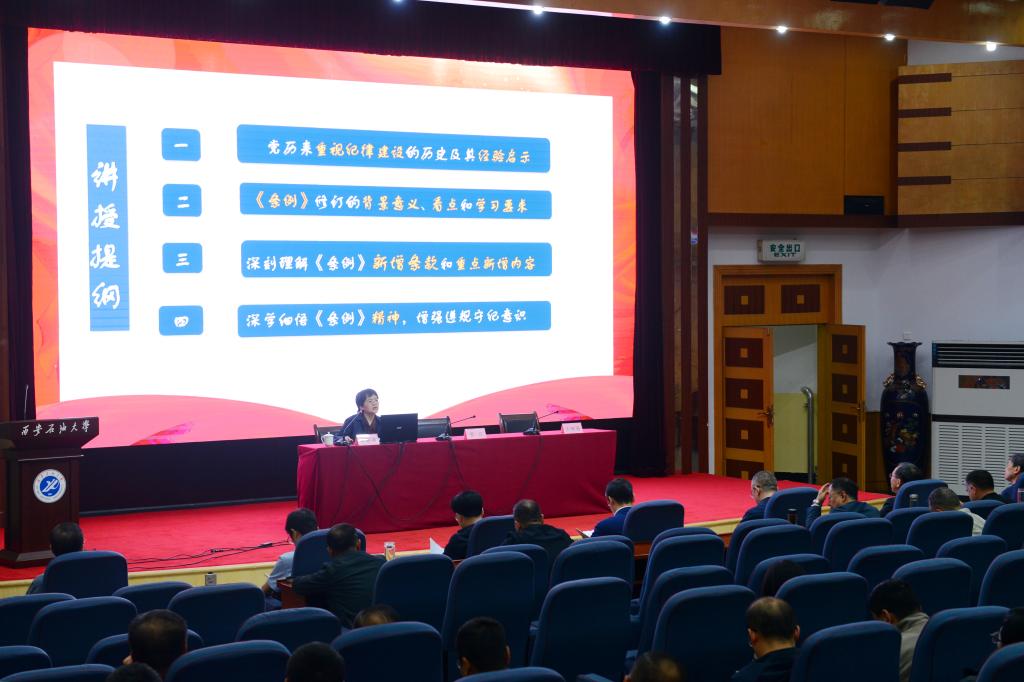 會(huì)上,李曉燕教授以“開(kāi)展黨紀(jì)學(xué)習(xí)教育 強(qiáng)化遵規(guī)守紀(jì)意識(shí)”為題,圍繞學(xué)習(xí)新修訂的《條例》,從介紹修訂過(guò)程,闡述修訂意義,聚焦《條例》總則、政治紀(jì)律、組織紀(jì)律、廉潔紀(jì)律、群眾紀(jì)律、工作紀(jì)律、生活紀(jì)律等,解讀《條例》修訂內(nèi)容,提出貫徹落實(shí)新《條例》有效舉措等方面,作了專(zhuān)題輔導(dǎo)報(bào)告。報(bào)告重點(diǎn)突出,觀點(diǎn)鮮明,資料詳實(shí),分析深刻,為進(jìn)一步學(xué)習(xí)貫徹《條例》理清了思路、啟迪了思考。