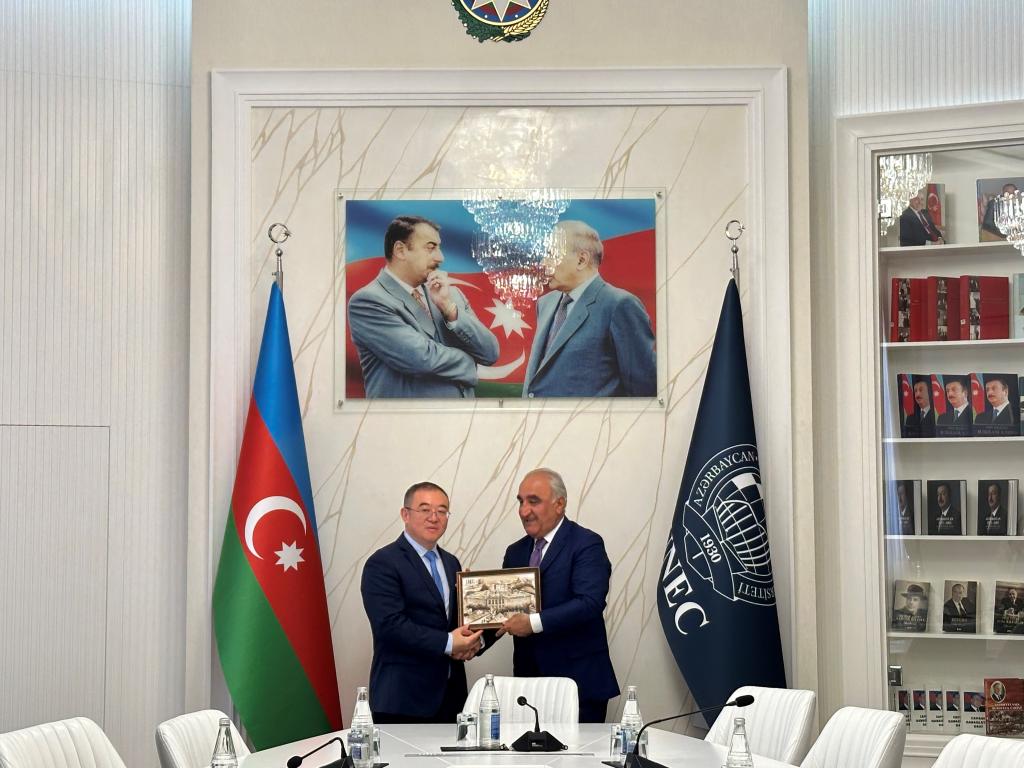 當(dāng)天下午,常江一行訪問(wèn)阿塞拜疆國(guó)立經(jīng)濟(jì)大學(xué),與該校校長(zhǎng)穆拉多夫舉行會(huì)談。常江介紹了我校發(fā)展歷史、師生規(guī)模、科研特色、國(guó)際化辦學(xué)等情況,分享了我校在油氣資源經(jīng)濟(jì)評(píng)價(jià)、產(chǎn)業(yè)與區(qū)域發(fā)展等領(lǐng)域取得的研究成果。穆拉多夫介紹了該校專業(yè)特色、人才培養(yǎng)、科學(xué)研究、國(guó)際合作等情況。座談后,雙方在聯(lián)合共建“阿塞拜疆研究中心”、師生互派互訪、學(xué)術(shù)交流及科研合作等方面達(dá)成合作意向。常江邀請(qǐng)穆拉多夫校長(zhǎng)今年6月來(lái)陜來(lái)校訪問(wèn),正式簽訂兩校合作備忘錄。