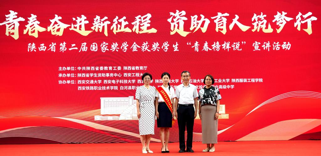 活動現(xiàn)場,省委教育工委、省教育廳總會計師劉宏恩宣讀陜西省第二屆國家獎學金“青春榜樣說”成員名單和提名人選名單。教育部全國學生資助管理中心副主任涂義才、省委教育工委委員、省教育廳副廳長何玉麒為“青春榜樣說”成員頒發(fā)聘書。