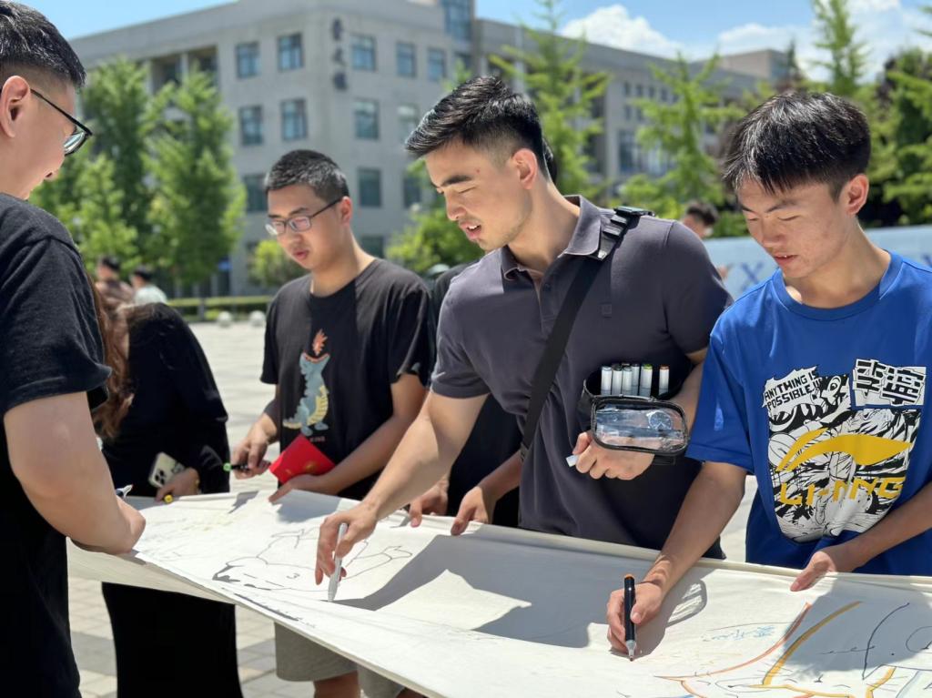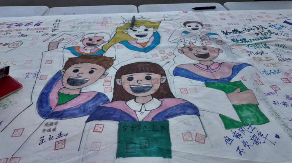 “輝煌明天長卷拓印”主題活動分別在鄠邑校區(qū)東區(qū)田徑場和圖書館南廣場展開。在田徑場上,長長的畫卷兩旁圍滿了熟悉的畢業(yè)生身影,大家用自己天馬行空的想象,或一人,或三三兩兩盡情地點墨揮毫、涂抹揮灑,表達離別之意?!吧礁咚L,一路壯歌,看我輝煌明天”,長卷上的這行文字閃耀著同學(xué)們大學(xué)四年的青春,洋溢著曾經(jīng)的點點滴滴,此事此刻,仿佛《輝煌明天》歌聲響起,大學(xué)生活在這一刻重現(xiàn),未來的日子在這一刻瞬間展望?,F(xiàn)場除了畢業(yè)生,也有在校生為即將離別的學(xué)長學(xué)姐送來祝福,大家聚集在一起,用不同的繪畫方式進行創(chuàng)作,同學(xué)們用歌聲,用歡笑,用心語,用自己的方式為未來的自己送上最美好的期許,為即將分別的母校送上最深厚的祝福。經(jīng)過數(shù)日的精心創(chuàng)作與準(zhǔn)備,6月14日中午,“輝煌明天長卷拓印”主題活動終于在鄠邑校區(qū)圖書館南廣場迎來了其收官之作,當(dāng)一條長達50余米的長卷鋪展開來,宛如一條歷史的長河,見證著學(xué)校的發(fā)展歷程和畢業(yè)生們的成長足跡?;顒蝇F(xiàn)場吸引了近千名師生踴躍參與、駐足觀賞,現(xiàn)場師生用自己的畫筆和色彩,在長卷上描繪出一幅幅充滿創(chuàng)意和希望的畫面,繪制現(xiàn)場熱鬧非凡,大家沉浸其中,充分施展才華,為長卷畫龍點睛、錦上添花,共同展開創(chuàng)作這幅波瀾壯闊的巨幅畫卷。長卷中各具特色的創(chuàng)作形式,出自師生們的奇思妙想和獨特創(chuàng)意,表達了畢業(yè)生對母校的不舍與感激,體現(xiàn)了老師們對學(xué)子最真摯的祝福與鼓勵。當(dāng)這條承載著畢業(yè)生們情感和回憶的長卷完成時,現(xiàn)場響起了熱烈的掌聲和歡呼聲,畢業(yè)生們紛紛上前合影留念,將這份難忘的記憶永遠定格在了這一刻。